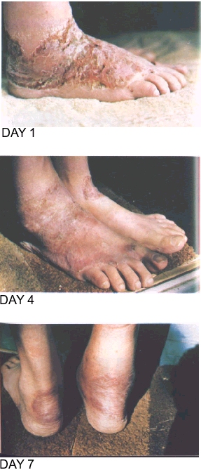 Clay packs and aloe vera were applied externally to the legs. On the fourth day, Patient reported, “The swelling in my right ankle is gone. It is now normal. The seal ing or encrustations on my feet, ankles, insteps and heels, began to fall away. I would say there is a 60-70 percent improvement. I am elated over the results.”