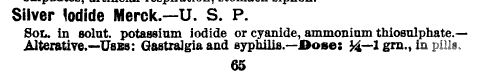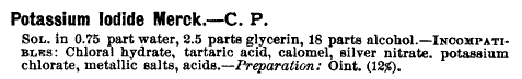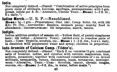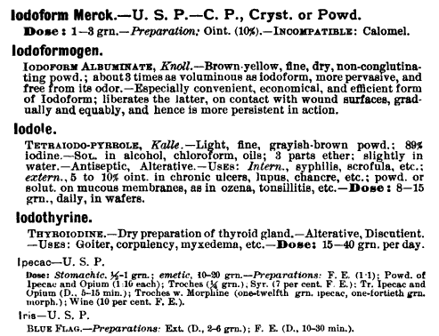 A search on "iodine" in the 1899 Merck Manual returns 96 hits. "Iodide", 100 hits. Were I to repeat the search using the term "iodopin" or "iodophorm", even more results would be returned...