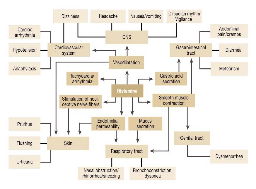 Next diagram shows all the symptoms associated with histamines, and the pathways
