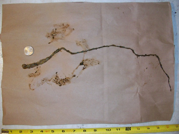 Did I mention yet that I had 3 parasite tests come back negative? This one looks like a giant whipworm, which are only supposed to attain a length of 5-6 cm. And yet, here is one that is 20 inches, if in fact it is a whipworm. It's also possible that there is a larger body that attaches to the left side because that edge seemed disconnected or torn open, without a discernible head or suc***. It's possible the head is still in me. How strange are these things! I think I have passed 5 different species of very large worms. Probably one from every third world country I've visited. During this afternoon's CE, I expelled another that was more deteriorated. Maybe he got caught in the other's tractor blade.